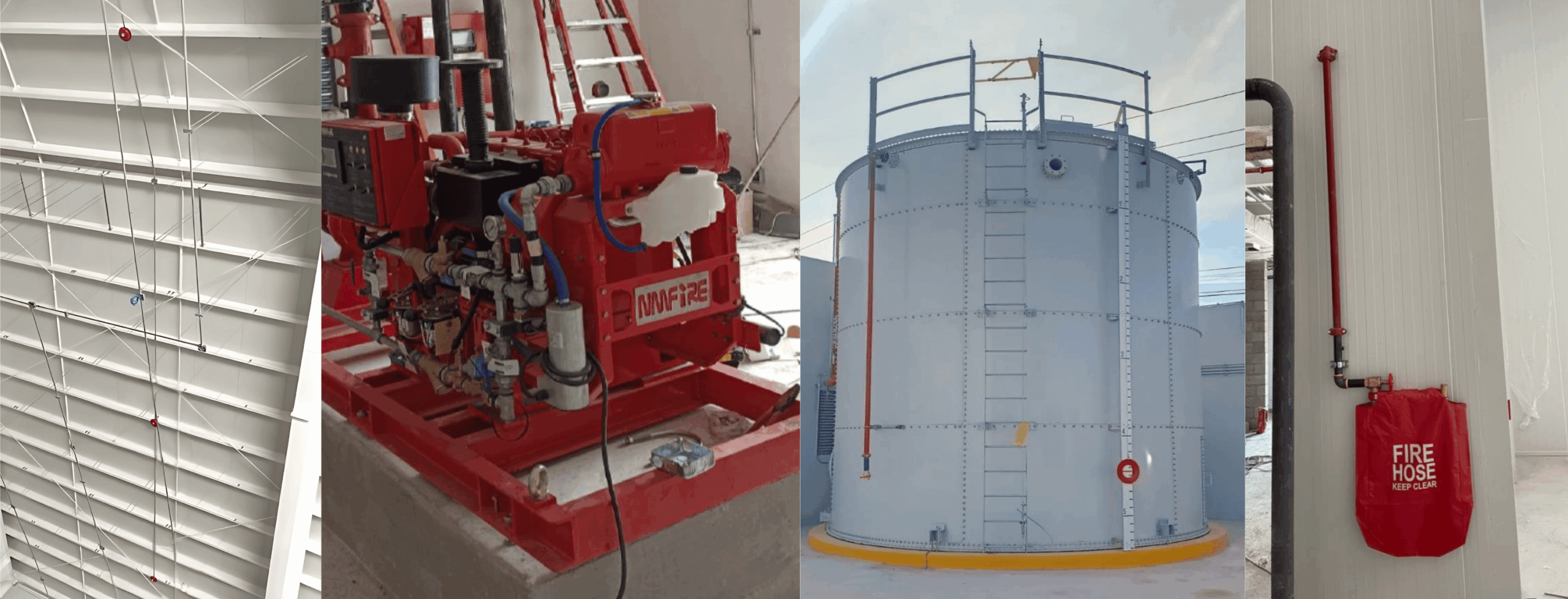 The system includes indoor fire hydrant stations with 1½” hoses, installed in service areas, process zones, warehouses, and offices, all in accordance with NFPA 14 standards. In addition, a 250 GPM diesel fire pump system was installed following NFPA 20 standards. Also, a 30,000-gallon fire protection water tank was installed in compliance with NFPA 22, and finally, a fire alarm and detection system was added according to NFPA 72.