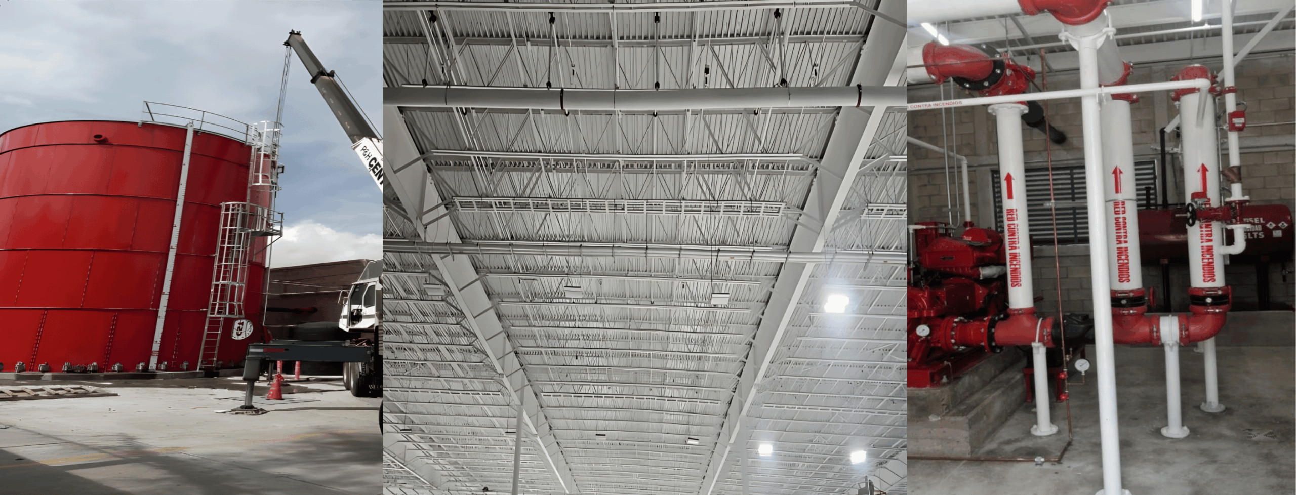 The system includes sprinkler protection in general offices, sales areas, service zones, offices, warehouses, cold rooms, and under-obstruction areas, all designed in compliance with NFPA 13 standards. In addition, an indoor fire hydrant network with 1½” hoses were installed according to NFPA 14, and a 1,500 GPM diesel fire pump system, in compliance with NFPA 20.