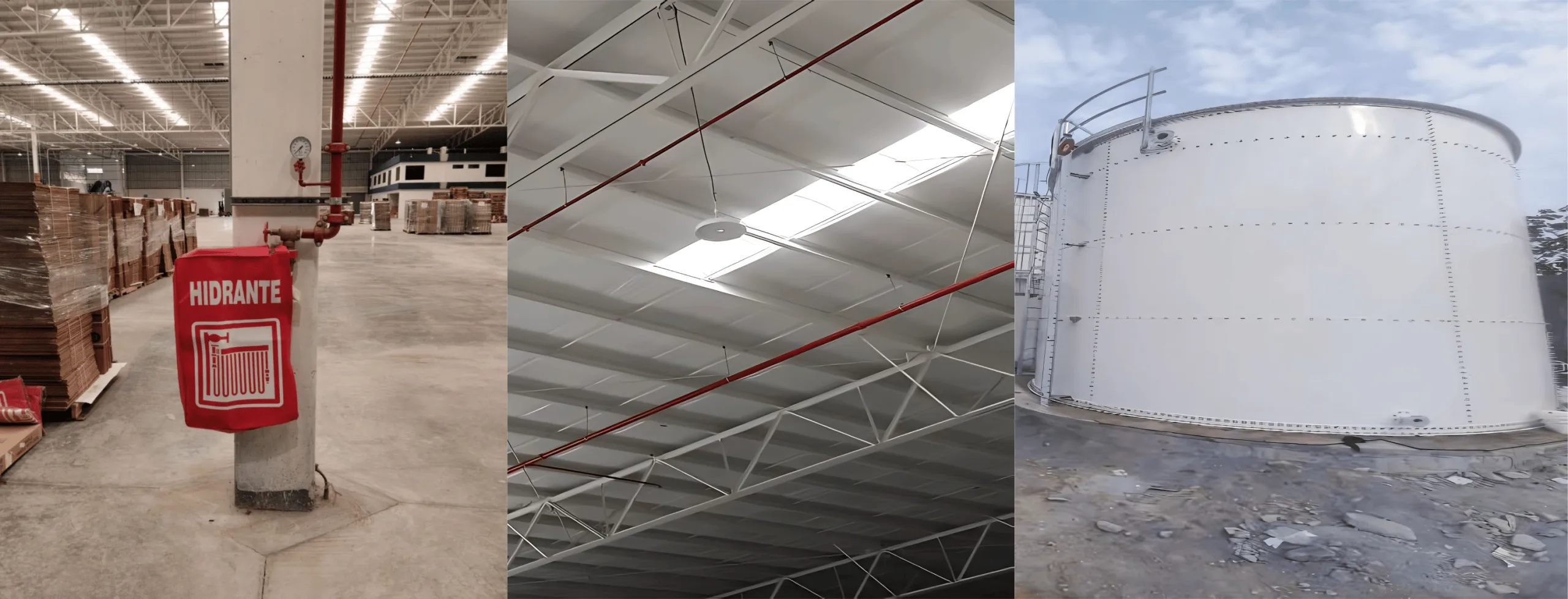 El sistema instalado incluye una Red de Hidrantes interiores con manguera de 1 ½”, de acuerdo con los estándares de NFPA 14. Posteriormente un Tanque con capacidad de 30,000 galones para protección contra incendio, de acuerdo con los estándares de NFPA 22. Adicionalmente se instaló un sistema de Alarma y Detección de humo óptico-lineal y fotoeléctricos ubicados al interior de la nave de acuerdo a los estándares de NFPA 72.