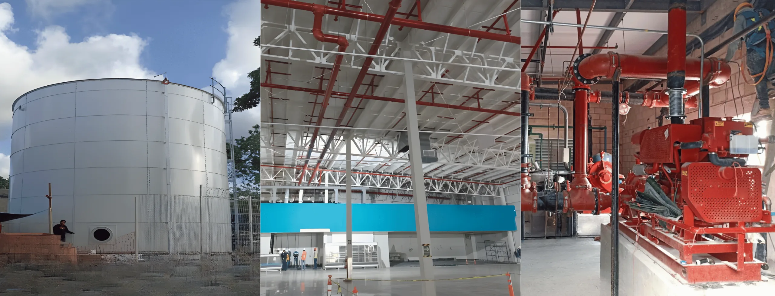 El sistema instalado incluye sistemas de Rociadores en área piso de ventas y trastienda, Rociadores bajo obstrucción, Rociadores en área oficinas generales, Rociadores en área de abarrotes, Rociadores en área cámaras frías y Sistema de pre-acción para proteger la subestación eléctrica, de acuerdo con los estándares de NFPA 13. Por otro lado, se instaló una Red de Hidrantes interiores con mangueras de 1 ½” y tomas siamesas, de acuerdo con los estándares de NFPA 14. Adicionalmente instalamos un sistema de Bombeo de 2,000 GPM diésel, eléctrica y jockey, conforme a los estándares de NFPA 20. Posteriormente, instalamos un Tanque atornillable para almacenamiento de agua PCI contra incendio, con capacidad de almacenaje de 200,000 galones, de acuerdo con los estándares de NFPA 22. Finalmente, se instaló un sistema de Alarma y Detección de acuerdo con los estándares de NFPA 72.
