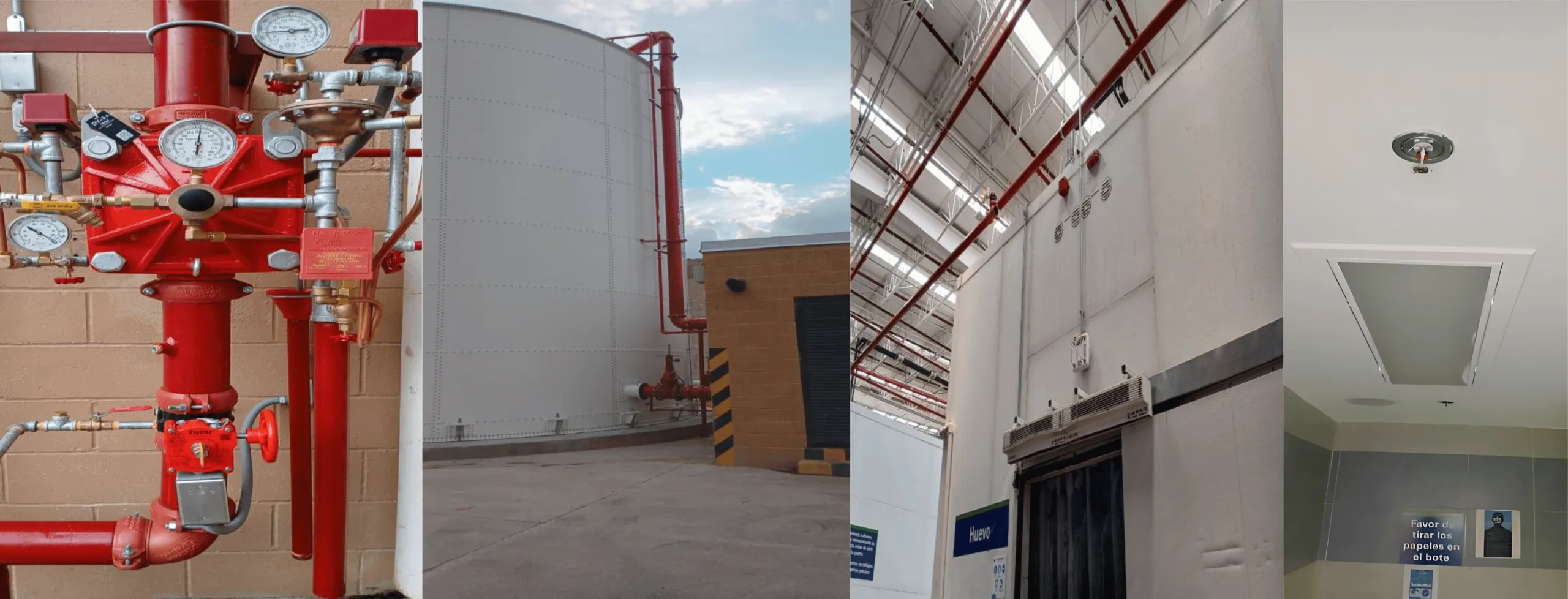 El sistema instalado incluye cambio de Riser’s, Rociadores en área de oficinas generales, Rociadores en área abarrotes, Rociadores en cubierta y Rociadores en área de cámaras frías de acuerdo con los estándares de NFPA 13. Por otro lado, se instaló una Red de Hidrantes interiores con mangueras de 1 ½” y tomas siamesas para bomberos, de acuerdo con los estándares de NFPA14. Adicionalmente instalamos un sistema de Bombeo de 2,000 GPM diésel, eléctrica y jockey, conforme a los estándares de NFPA 20. Posteriormente se realizó el mantenimiento al Tanque atornillable para almacenamiento de agua contra incendio con capacidad de almacenaje de 200,000 galones, de acuerdo con los estándares de NFPA 22. Finalmente, se instaló un sistema de Alarma y Detección de incendios de acuerdo con los estándares de NFPA 72.